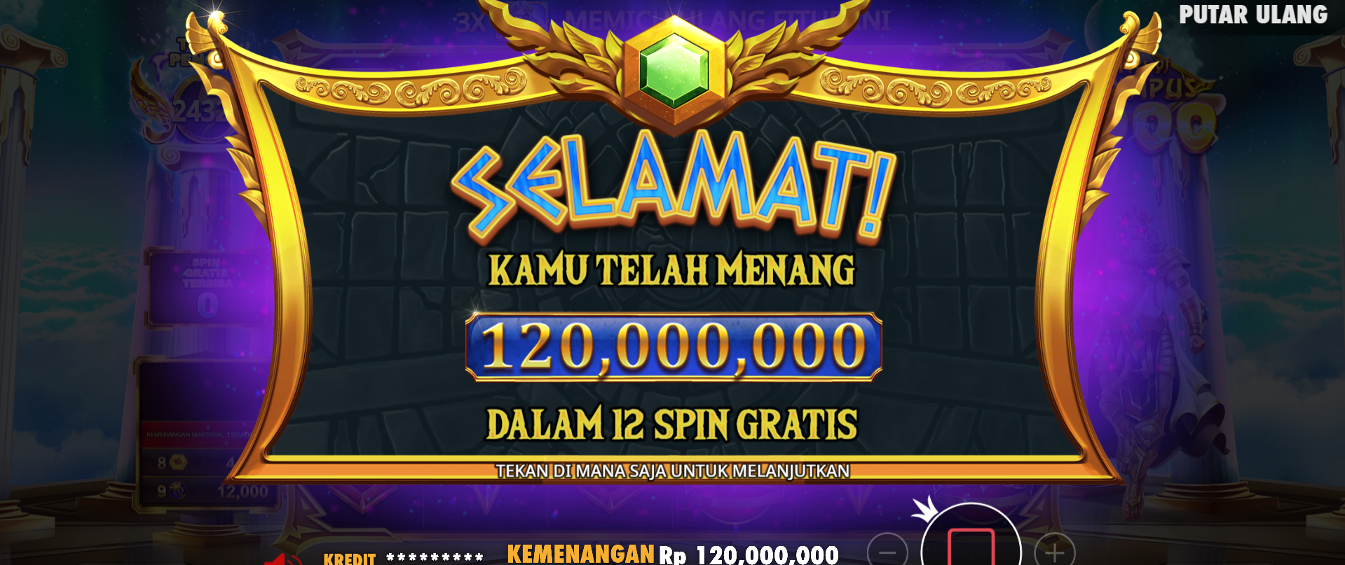 Pada spin ke-8 dari free spin, momen emas itu datang. Empat simbol mahkota berjejer rapi, dan Zeus menghantamkan petir dengan multiplier x500. Kombinasi simbol permata dan mahkota terus pecah, membuat layar penuh cahaya keemasan. Dalam hitungan detik, saldo naik dari ratusan ribu jadi jutaan, lalu puluhan juta. Di akhir sesi, total kemenangan tercatat mencapai Rp120.000.000 — angka fantastis untuk modal yang hanya Rp10.000.