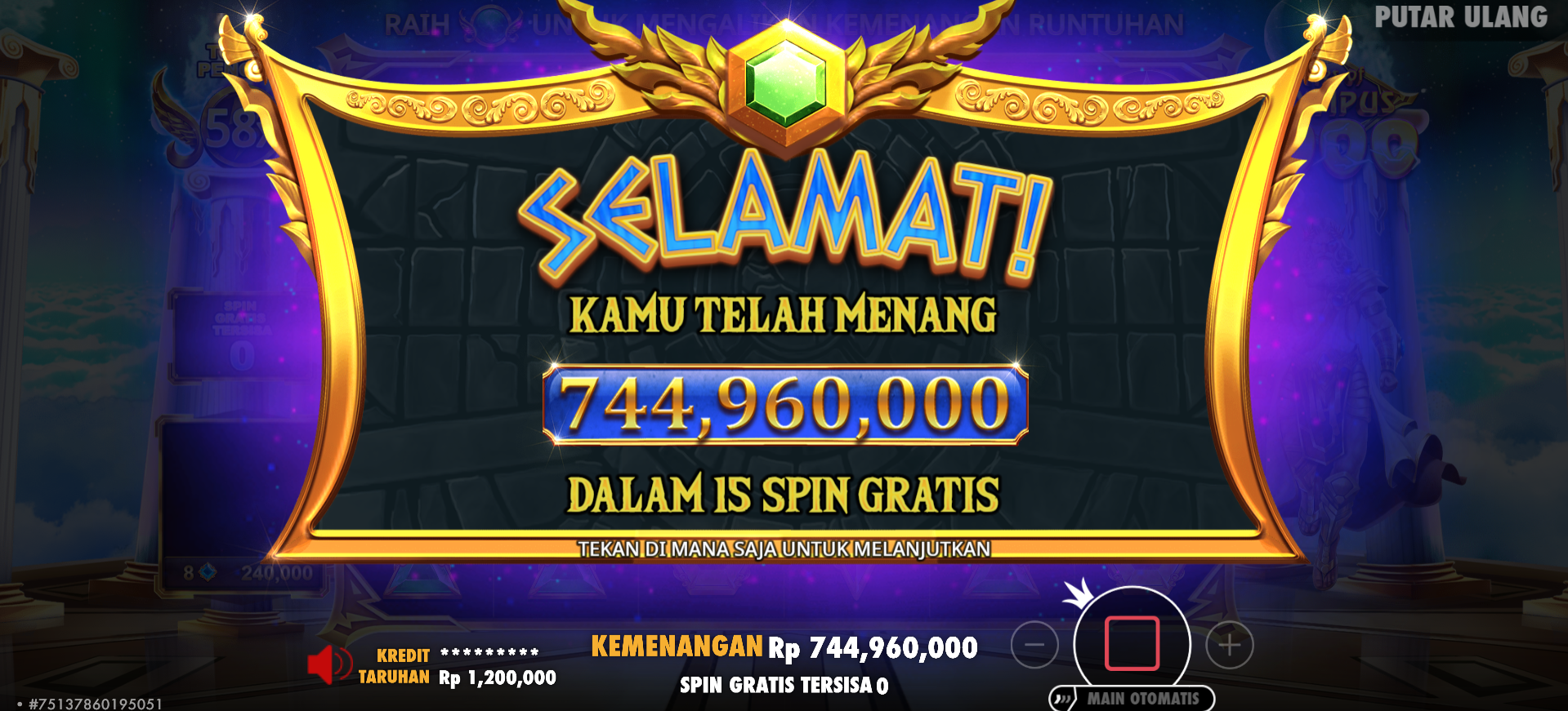 Kemenangan gates of olympus kembali mencetak sejarah besar di BANDAR36. Seorang member dengan user ID bob***1 sukses meraih total kemenangan fantastis senilai 744 juta rupiah hanya dengan modal bet 1,2 juta rupiah. Peristiwa luar biasa ini langsung menjadi bahan pembicaraan di komunitas slot online karena nominalnya yang begitu mengejutkan.