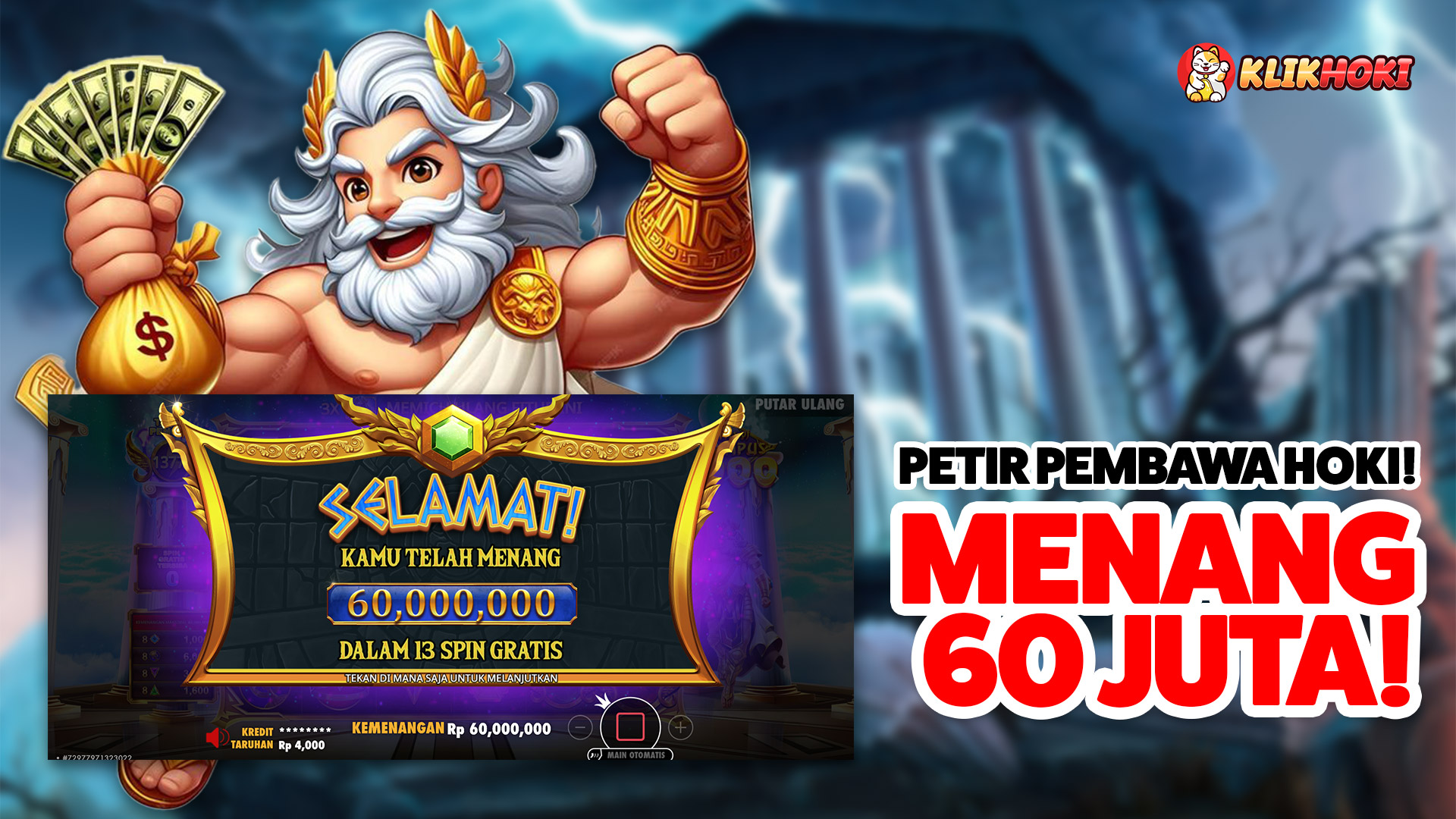 Ketika Zeus mulai melemparkan petirnya bertubi-tubi, multiplier x15 dan x20 muncul hampir bersamaan. Hasilnya, deretan simbol mahkota dan cincin bernilai tinggi jatuh beruntun, menghasilkan kombinasi besar hingga mencapai total kemenangan 60 juta rupiah.