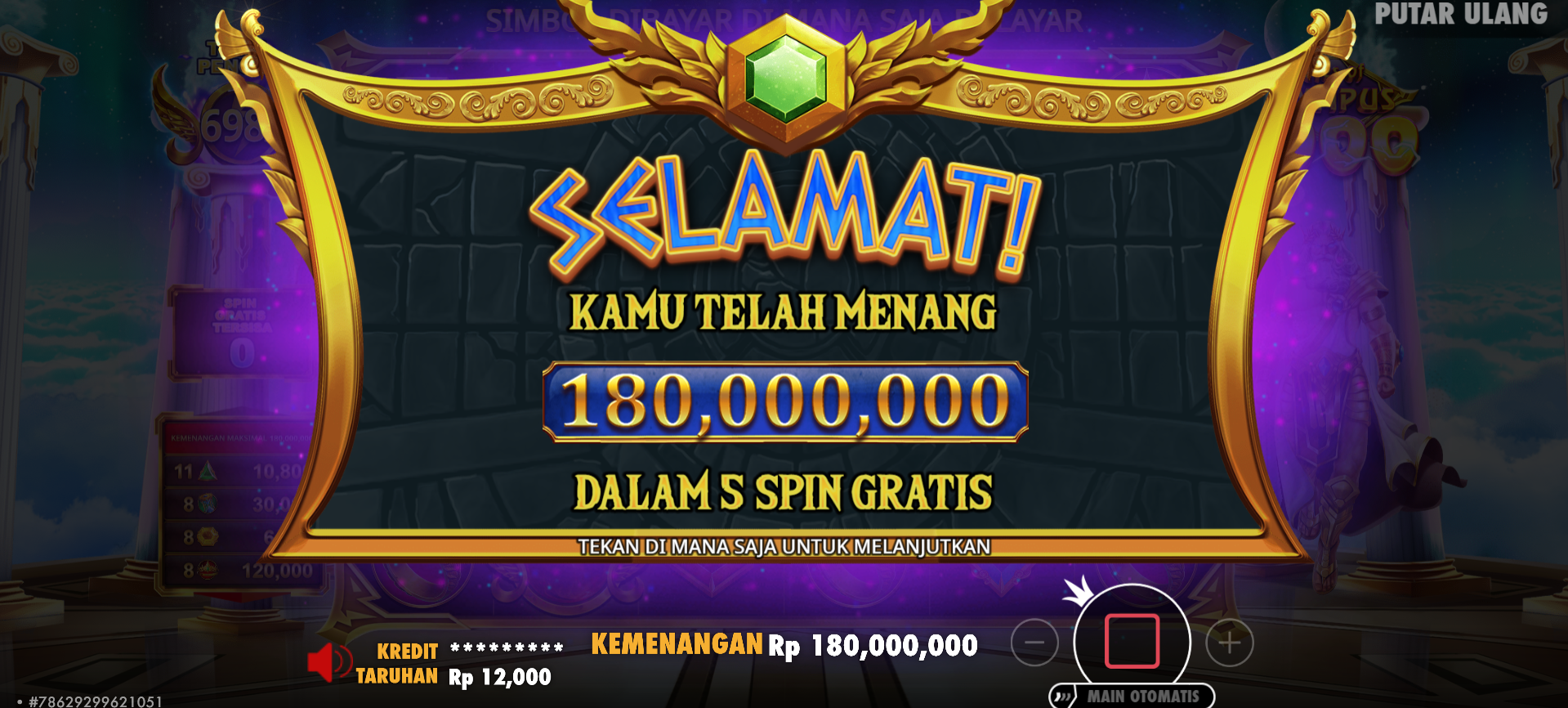 Selama fitur berjalan, simbol Zeus secara konsisten menghadirkan multiplier besar yang dikombinasikan dengan tumble beruntun. Dari sinilah lonjakan saldo mulai tercipta. Total kemenangan terus bertambah hingga akhirnya mencapai angka 180 juta rupiah, sebuah hasil yang tergolong luar biasa dari modal yang relatif kecil.